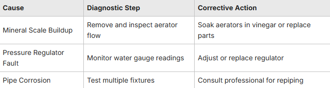 Scale accumulation, failing pressure regulators and corroded galvanized pipes constrict water flow over time. Each cause generates distinct symptoms—sediment blockage yields irregular spurts, regulator failure produces sudden pressure spikes, and corrosion results in chronic low output across multiple fixtures.