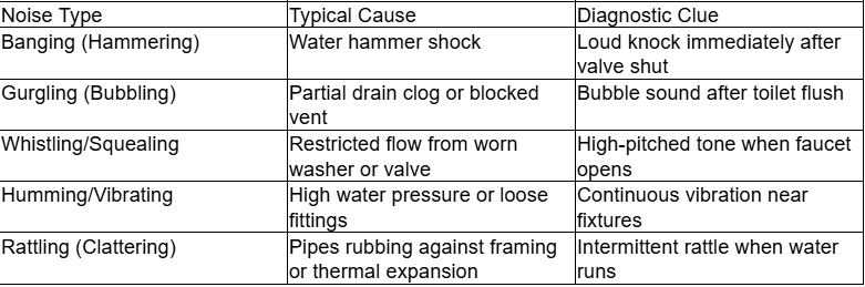 Below is an overview of five typical plumbing noises, their primary causes and diagnostic clues: