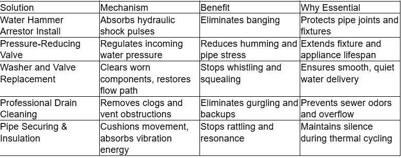 Resolving plumbing noise entails targeted fixes that address the root mechanism—whether hydraulic shock, flow restriction or mechanical vibration. Professional water hammer arrestor installation, pressure regulation, valve replacement and pipe securing form a comprehensive toolkit.