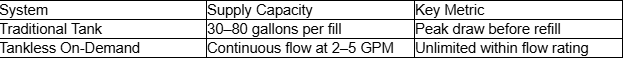 Traditional tanks may run out under heavy simultaneous demand, whereas tankless units sustain flow up to their GPM limit. Recognizing this difference informs selection based on household usage patterns.